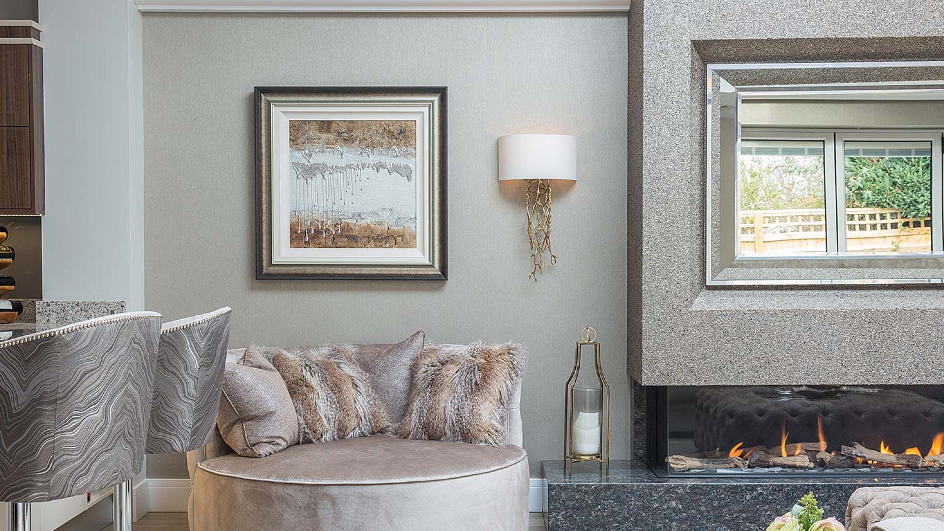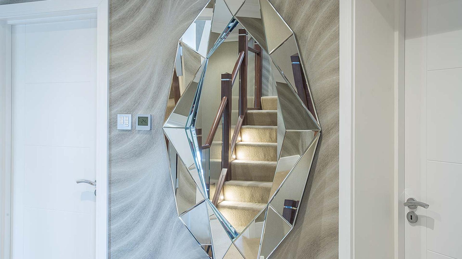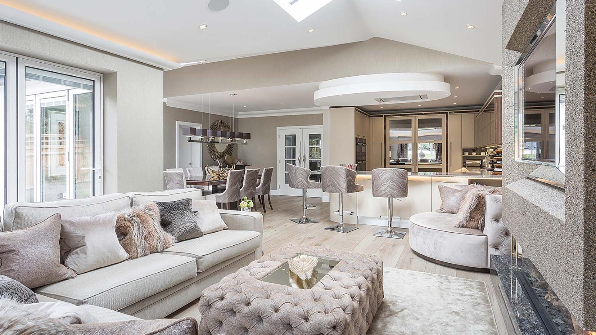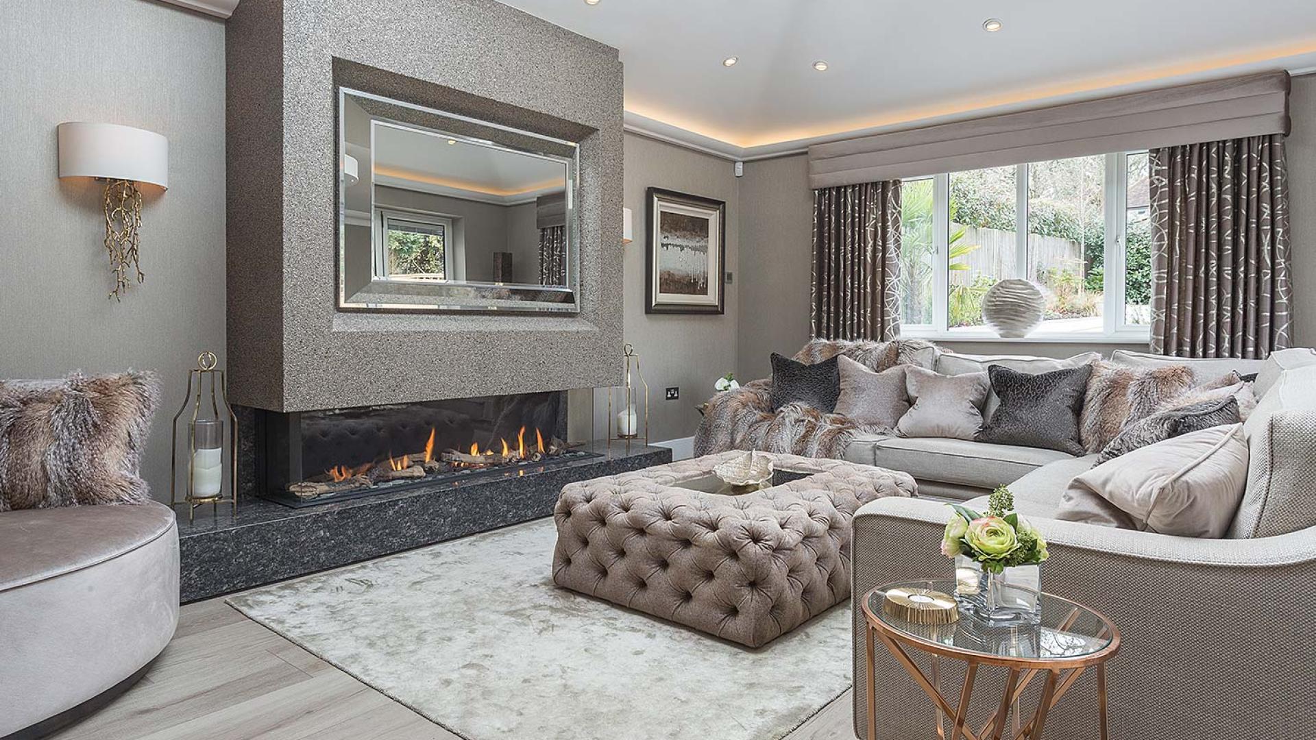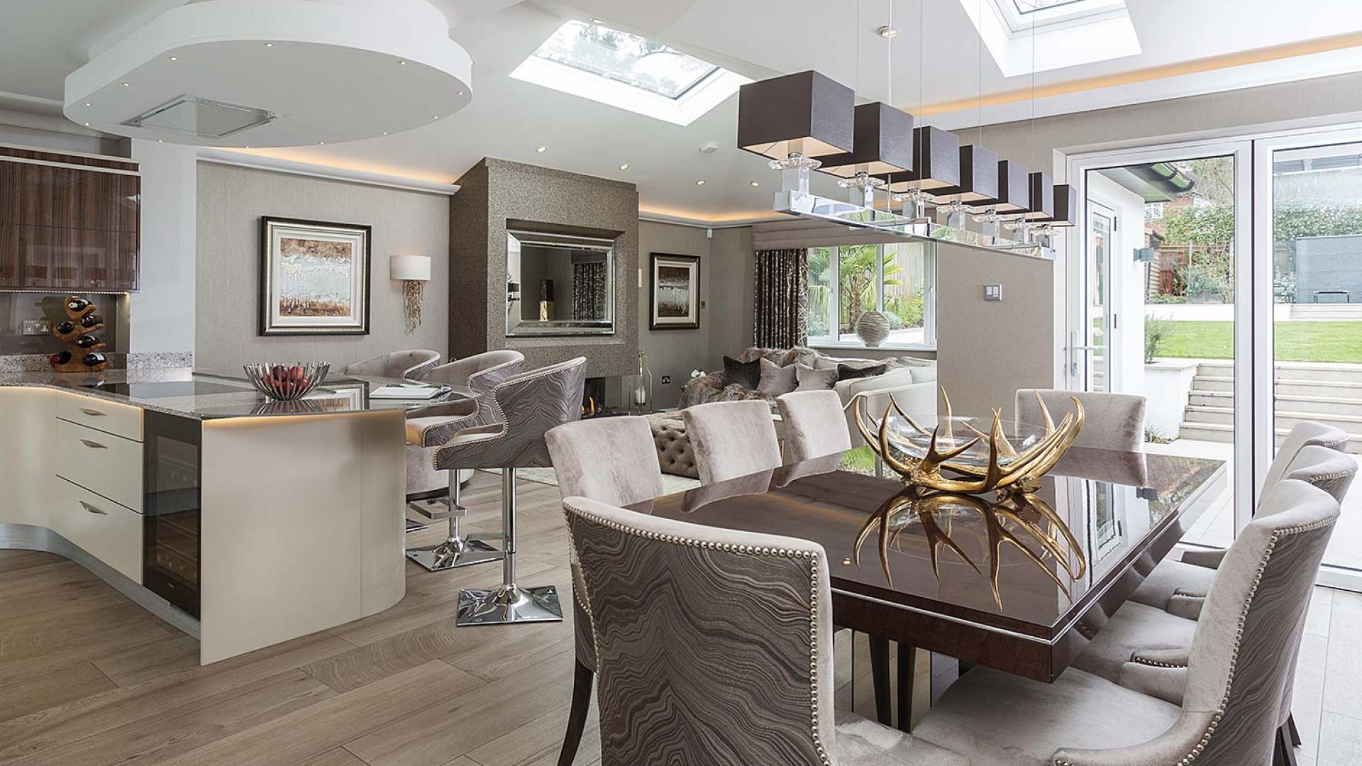 At the heart of the project is the stunning Kitchen/Diner, with bespoke Kitchen designed and created in conjunction with fine-furniture manufacturer Stoneham Kitchens, which incorporates tinted mirror doors and walnut inlay detailing. The showstopper of the project is the complex bespoke fireplace designed to fit the custom-made mirror TV and 3-sided linear gas fire.