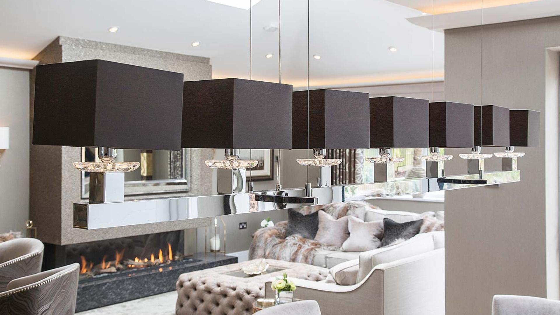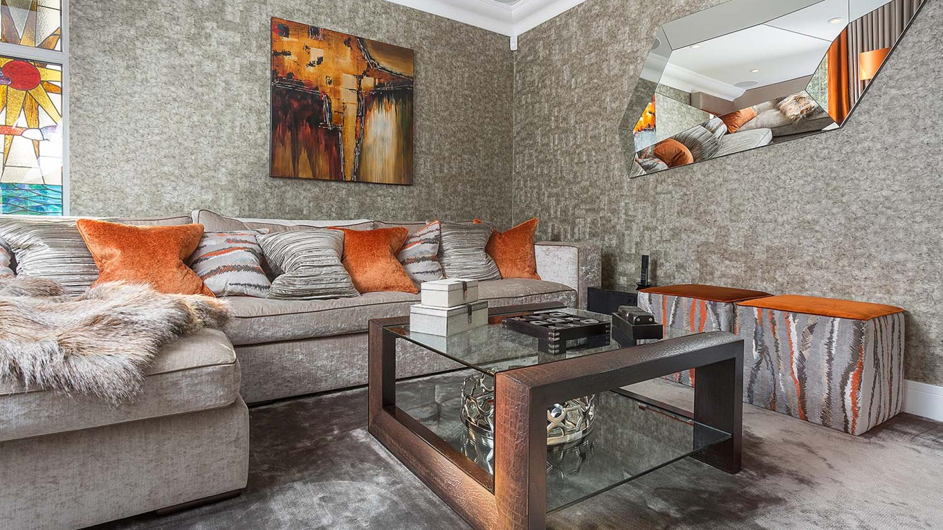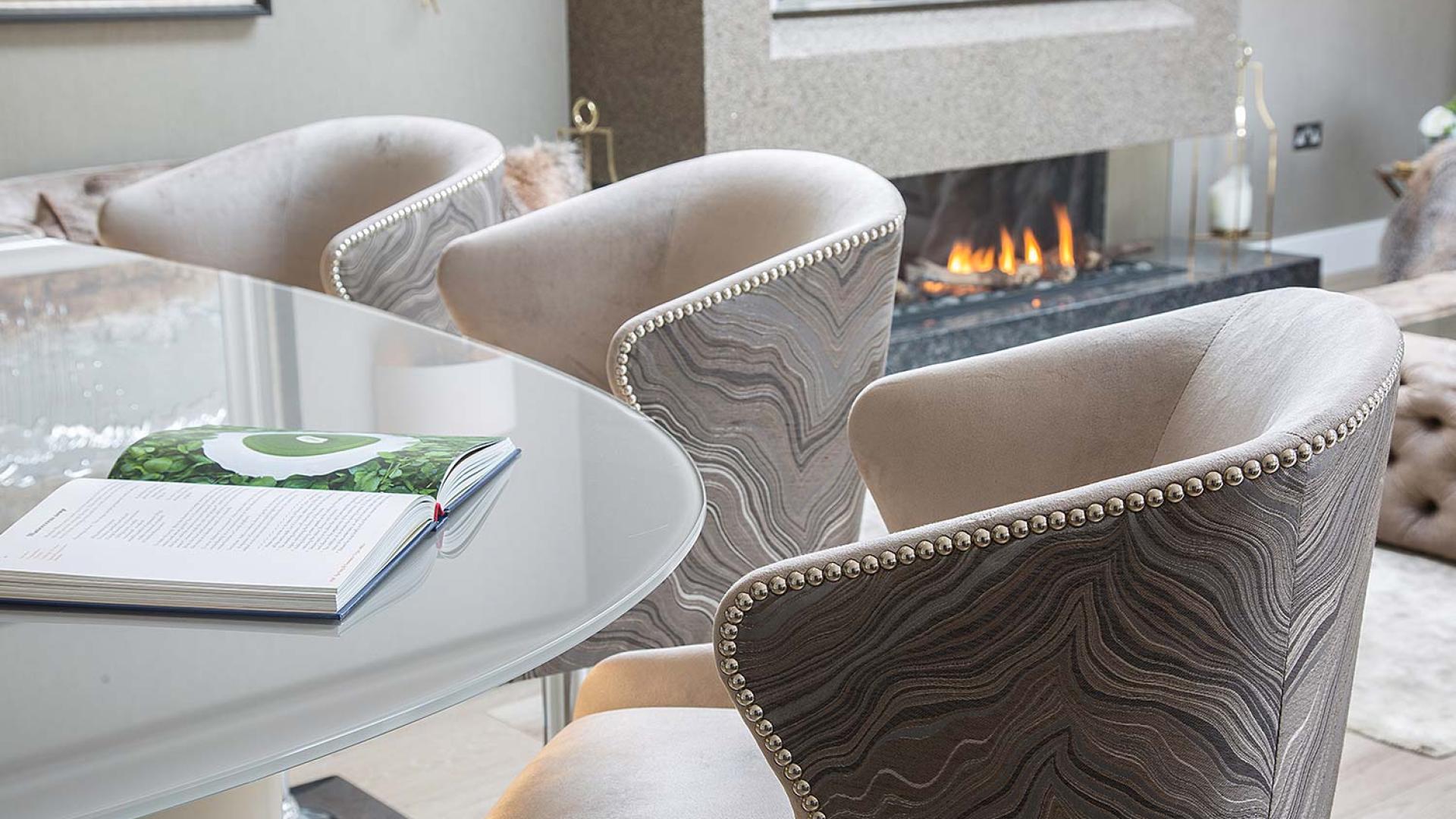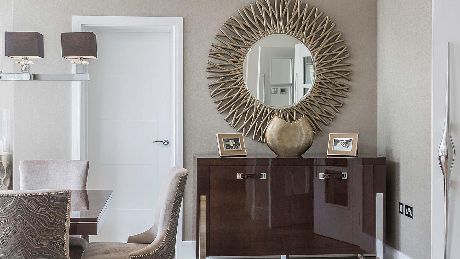 At the heart of the project is the stunning Kitchen/Diner, with bespoke Kitchen designed and created in conjunction with fine-furniture manufacturer Stoneham Kitchens, which incorporates tinted mirror doors and walnut inlay detailing. The showstopper of the project is the complex bespoke fireplace designed to fit the custom-made mirror TV and 3-sided linear gas fire.