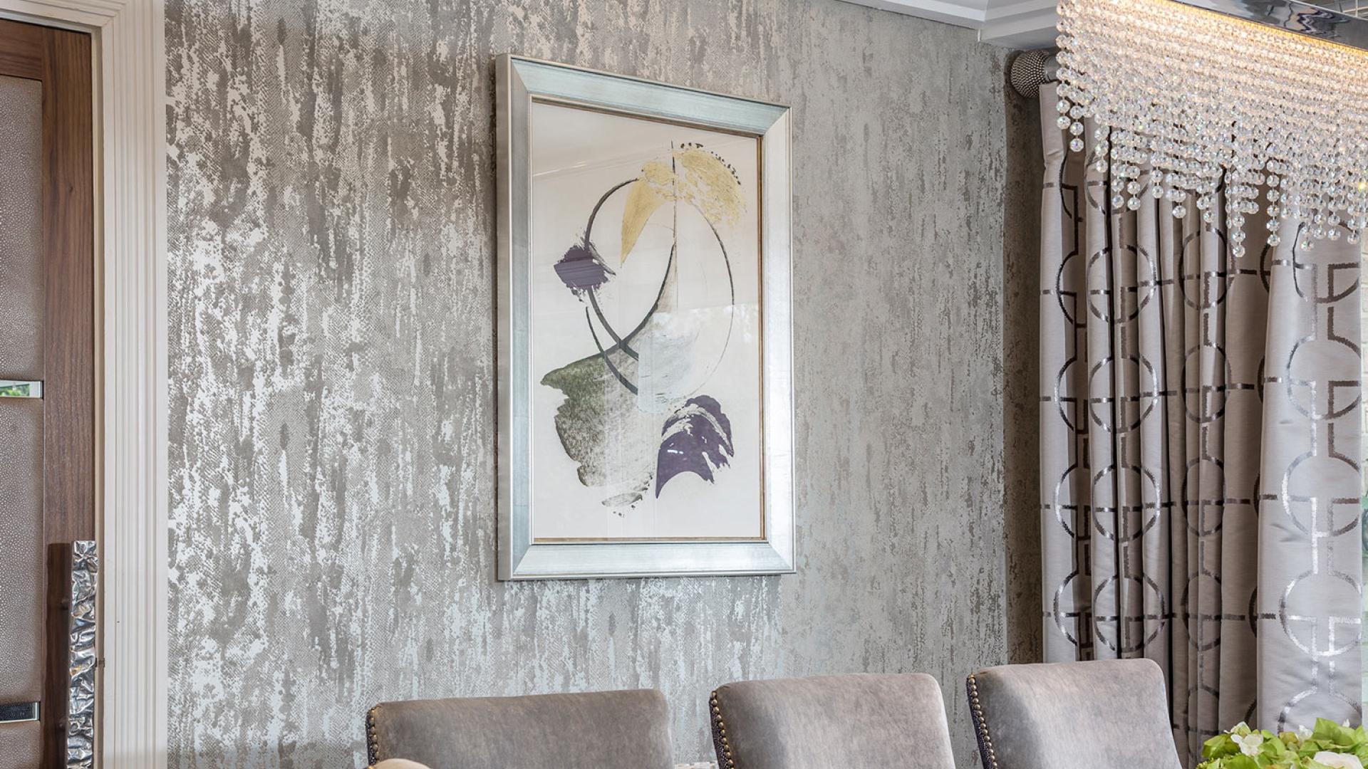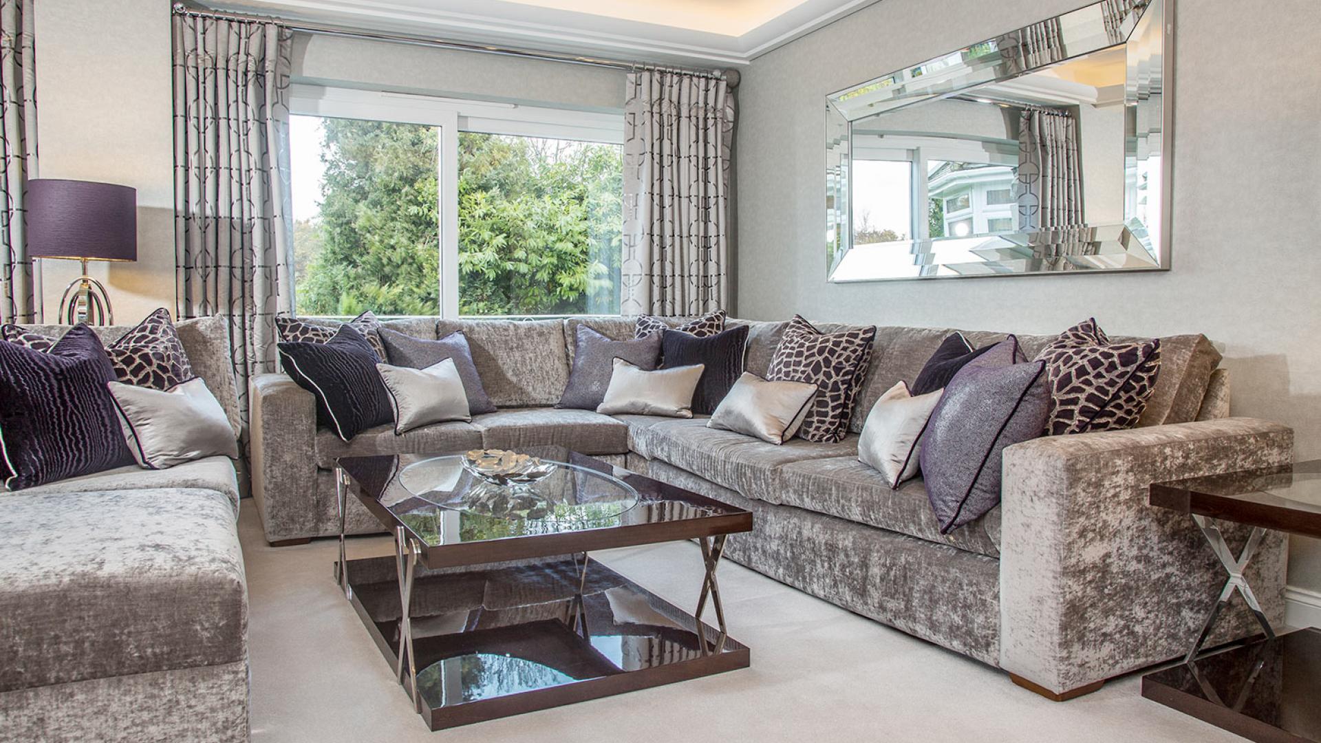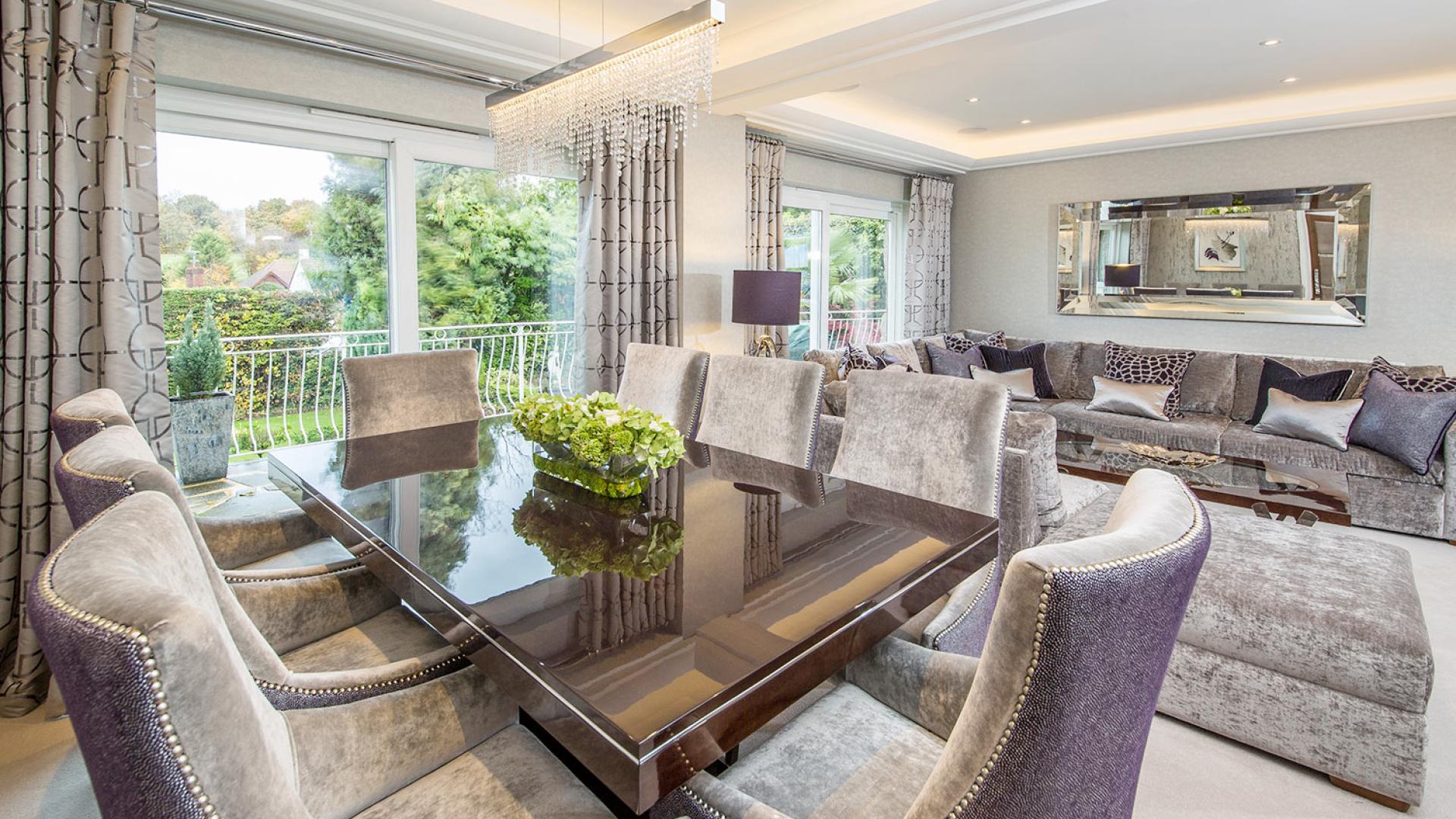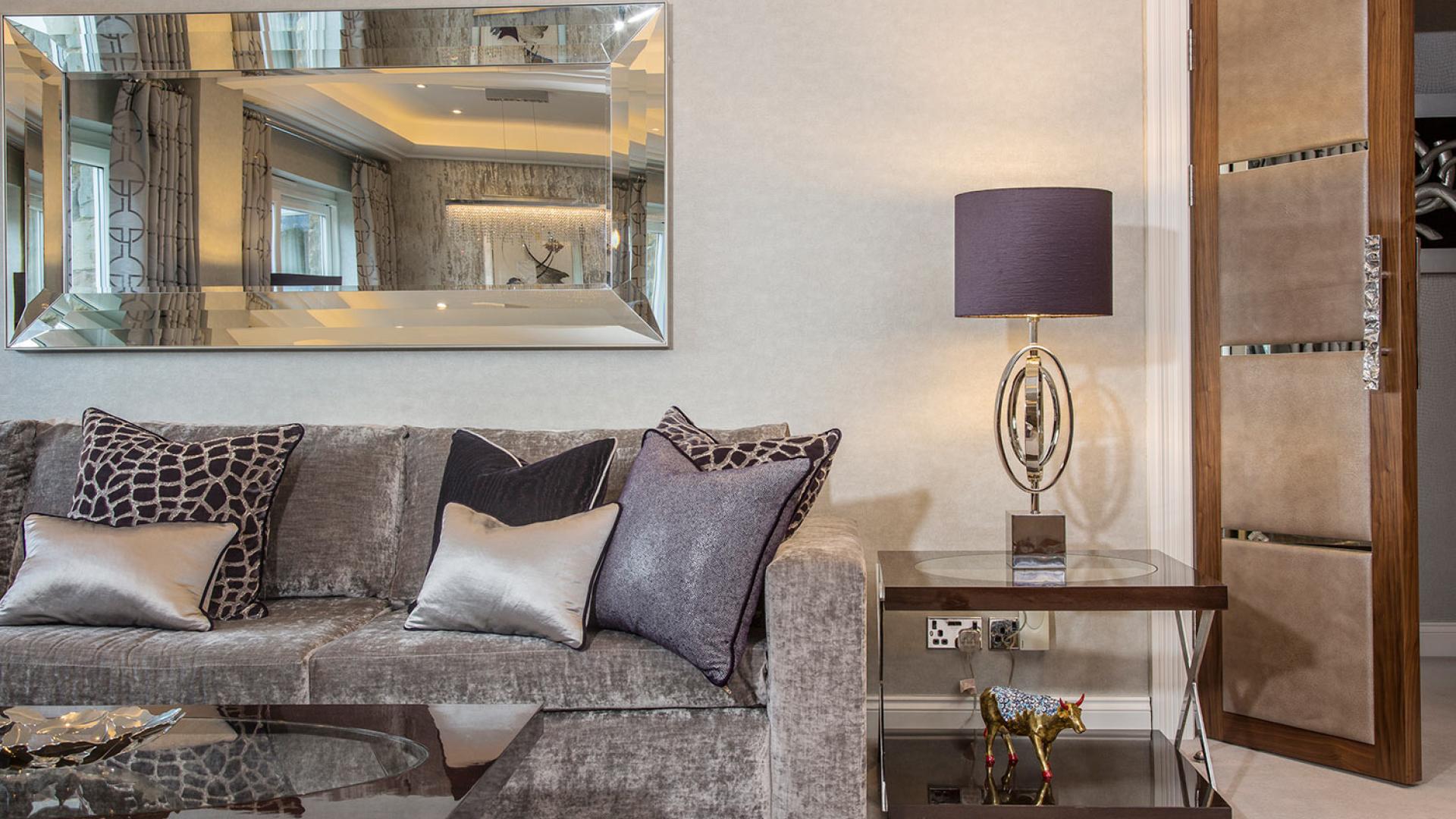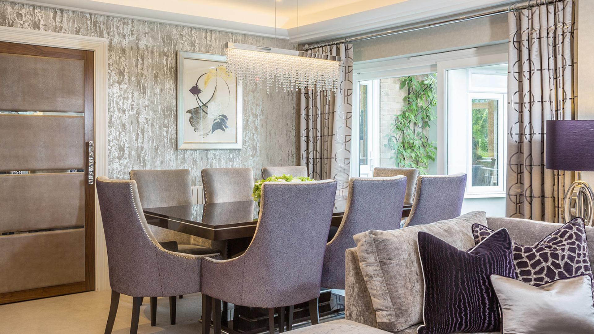 They wanted to create a look that was both effortless and elegant but also individual. We used a neutral pallet of greys with an accent of purple to create this design; the unusual wallpaper provides a dramatic yet stunning backdrop to the scheme.