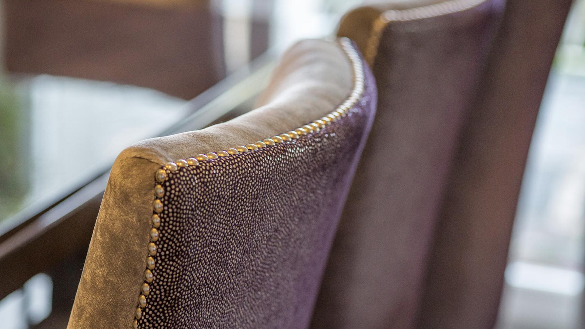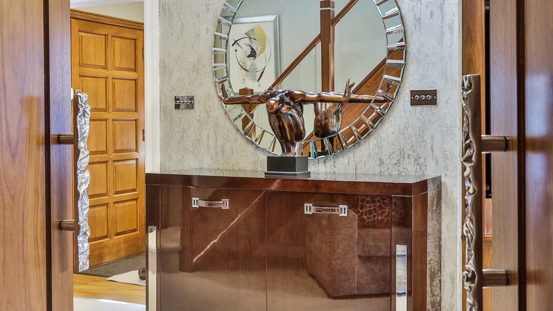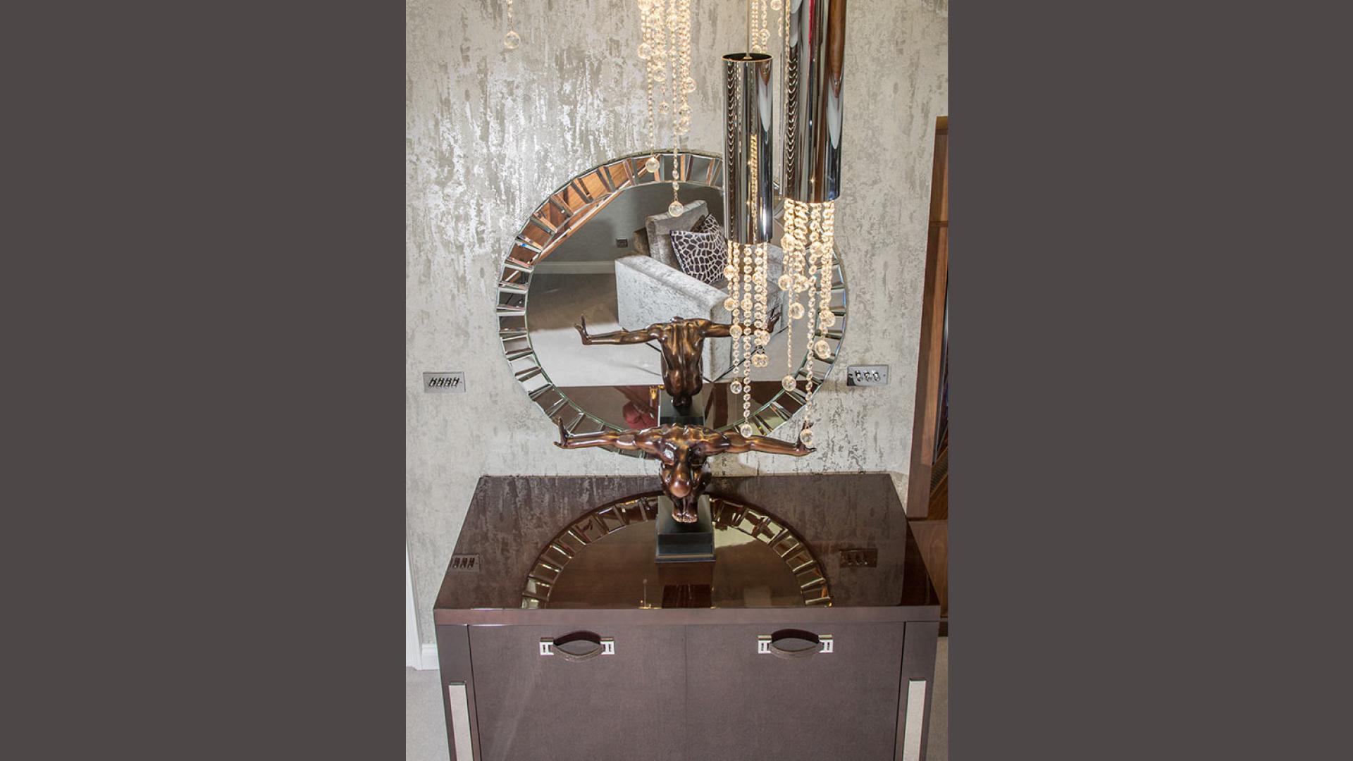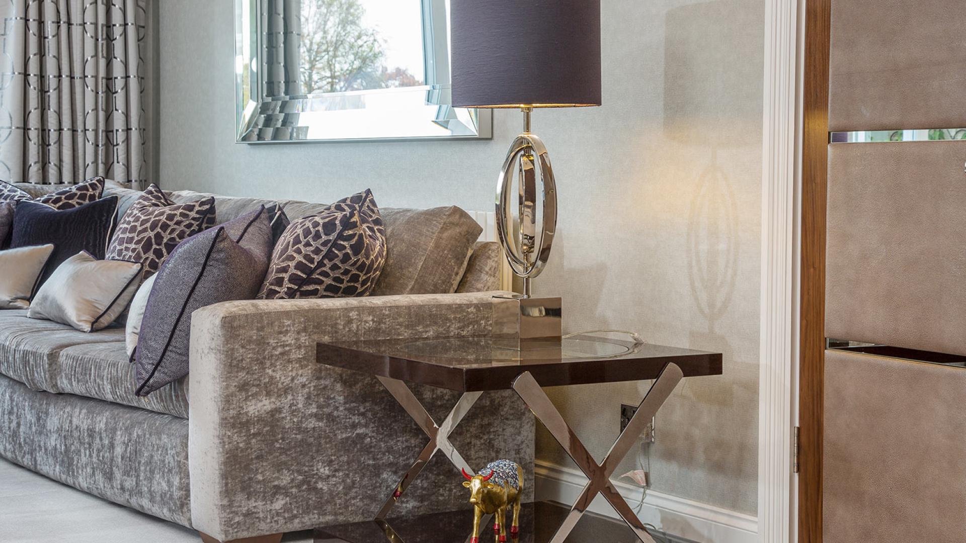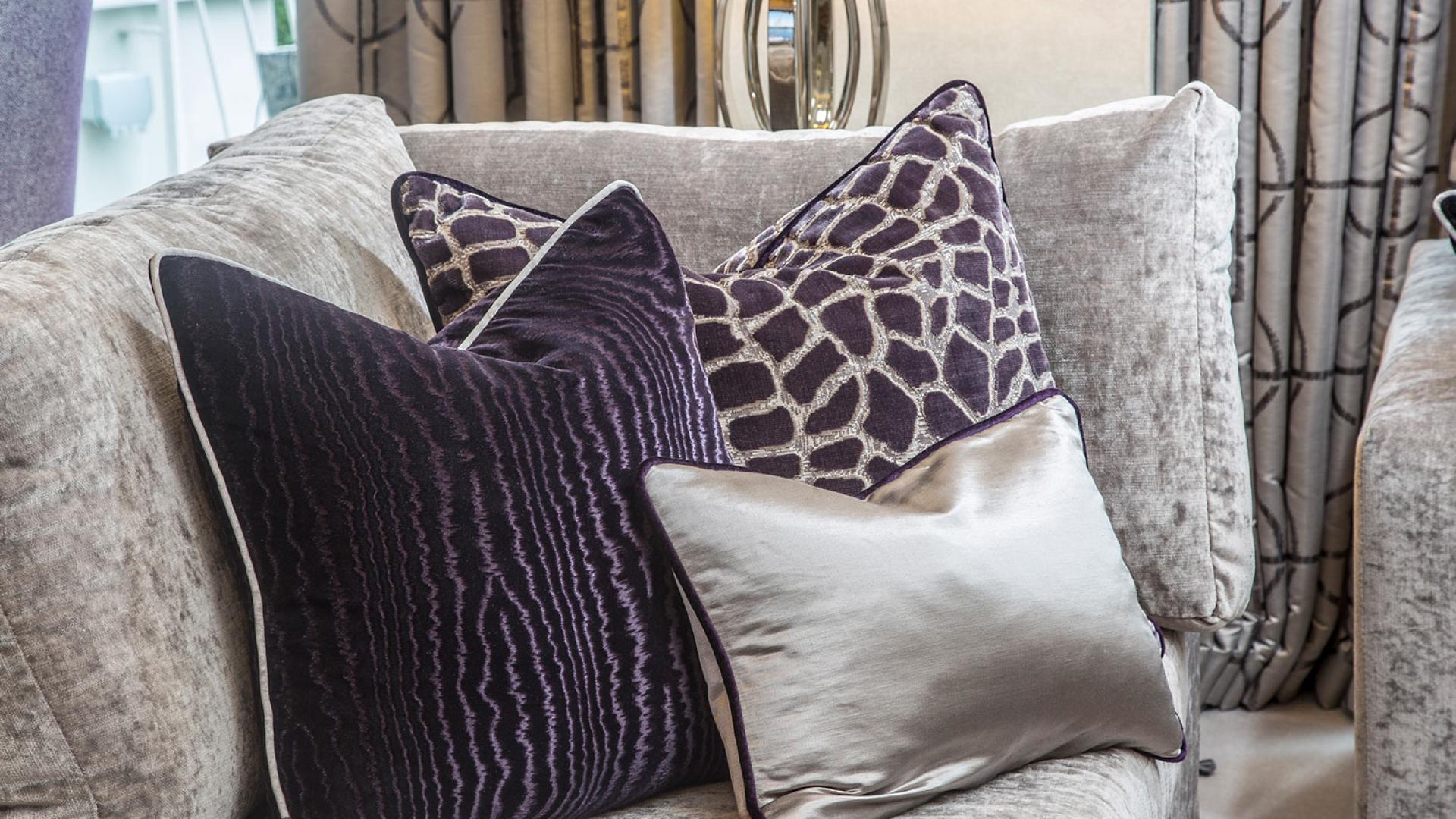 They wanted to create a look that was both effortless and elegant but also individual. We used a neutral pallet of greys with an accent of purple to create this design; the unusual wallpaper provides a dramatic yet stunning backdrop to the scheme.