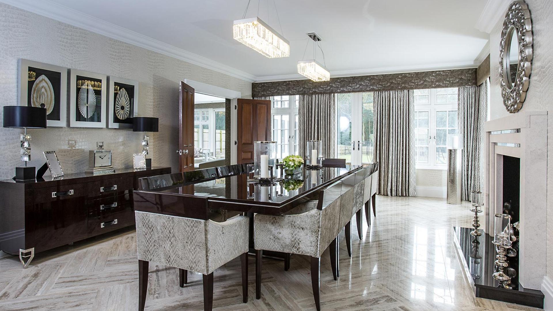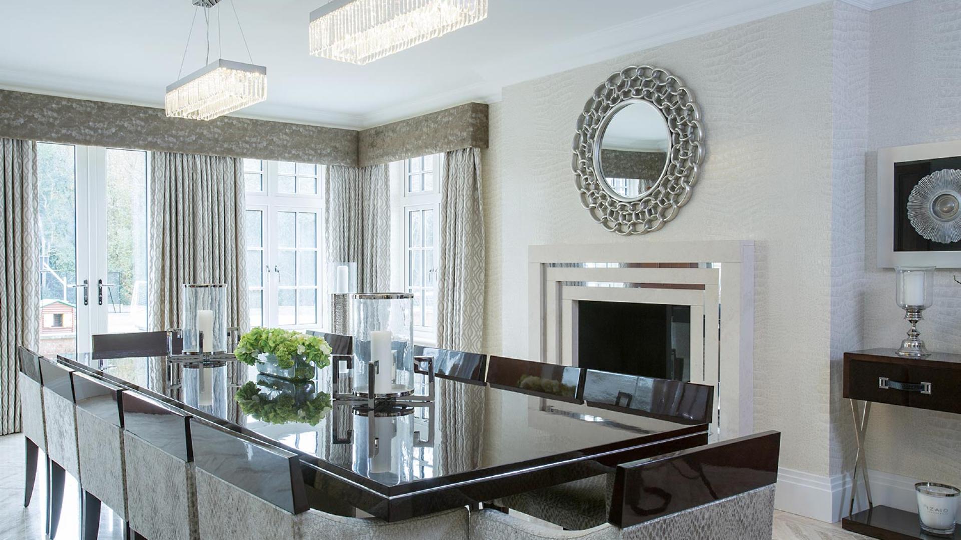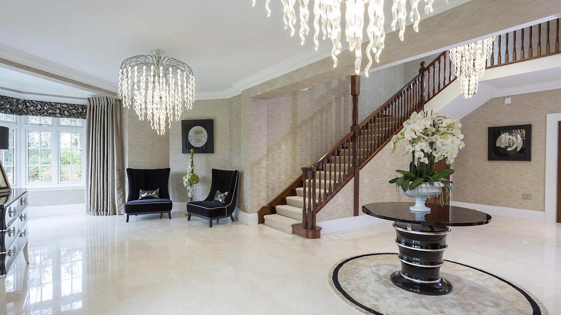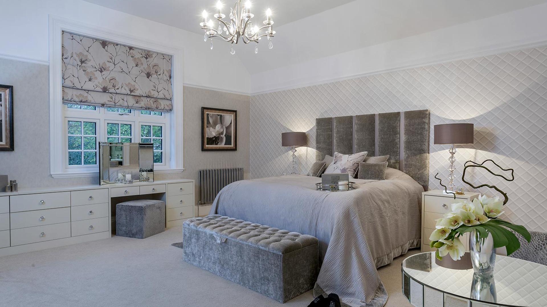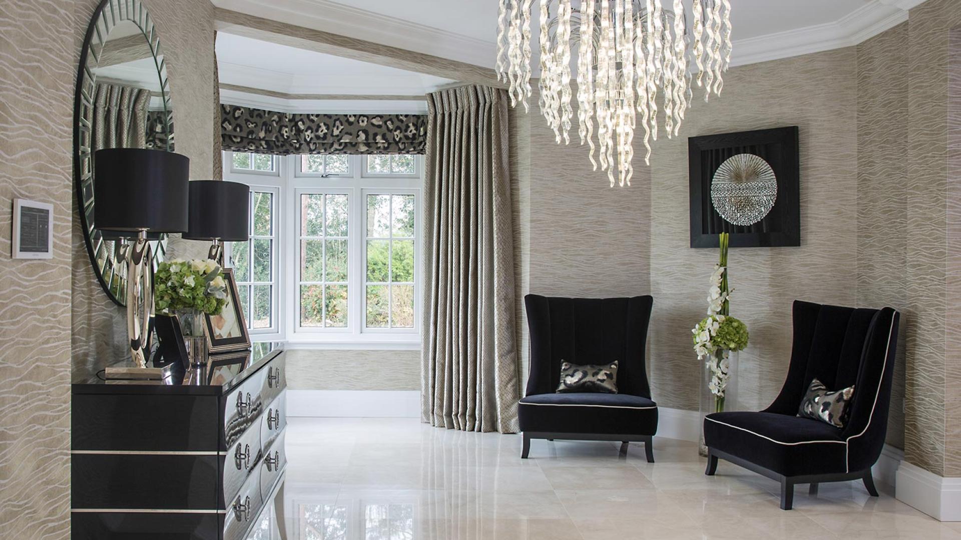 The project was implemented across a number of phases and included a set of stunning chandeliers, with the largest taking centre stage in the galleried landing. We gave each of the 5 bedrooms its own personality, from the relaxing suite for guests to enjoy, to a princess-inspired bedroom for the youngest member of the family. We are particularly proud of the bespoke joinery designed and fitted in the Master Dressing Room and Orangery, which both include exquisite mirror inlay detailing and beautiful fabric panelling.
