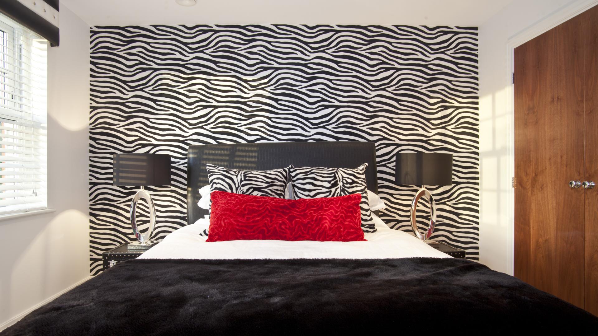 Our client had two teenage children who requested funky and bright bedrooms. For the first room we created a Malibu inspired scheme using bright ocean blues and lime greens. For the second we opted for a funky animal inspired room featuring studded bedside tables.