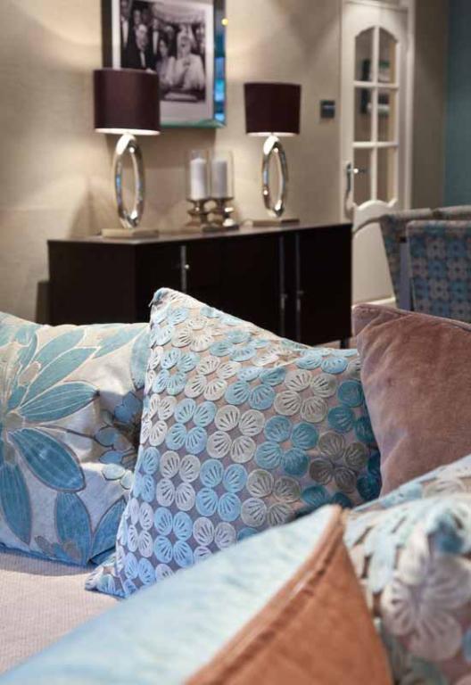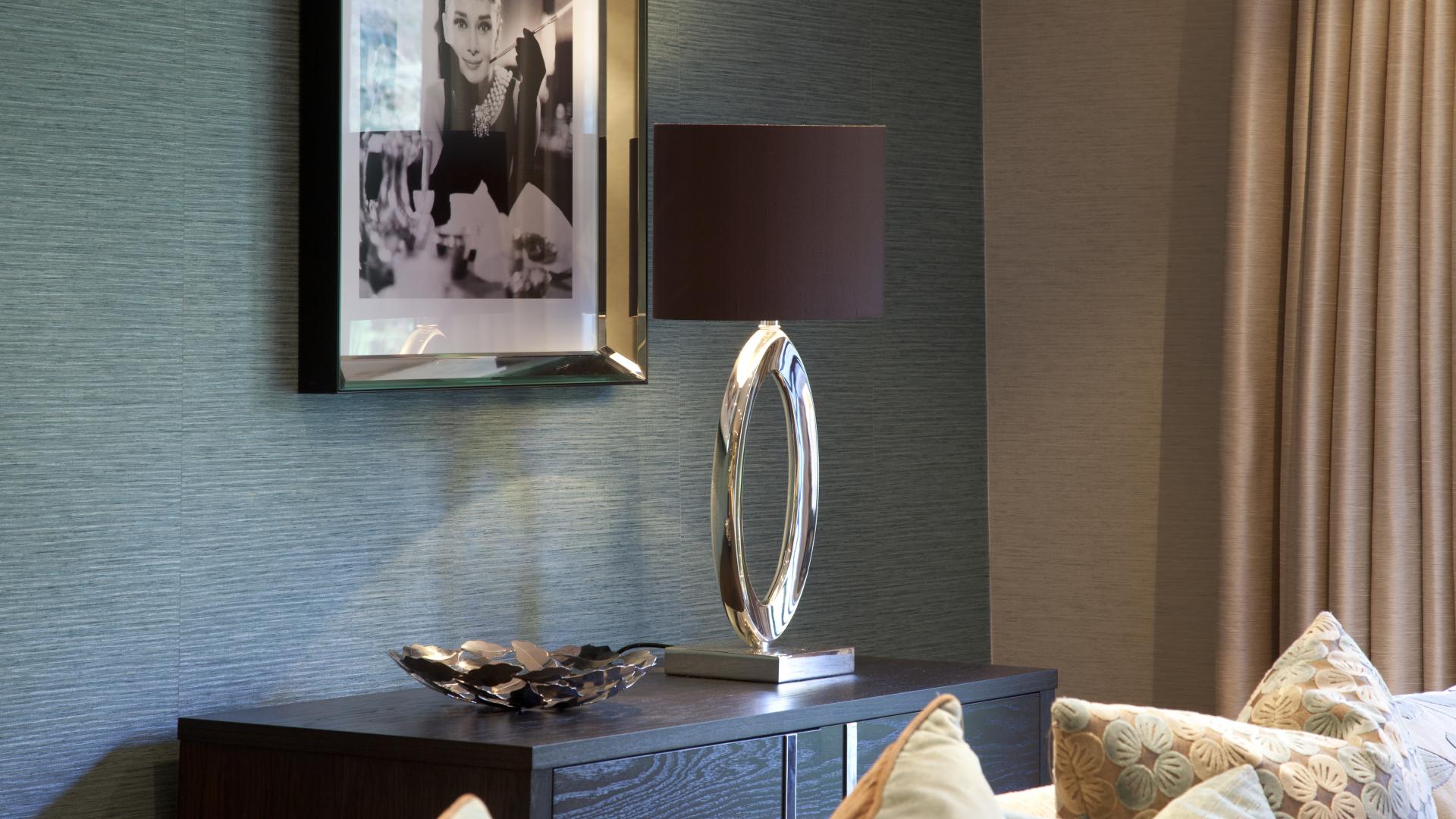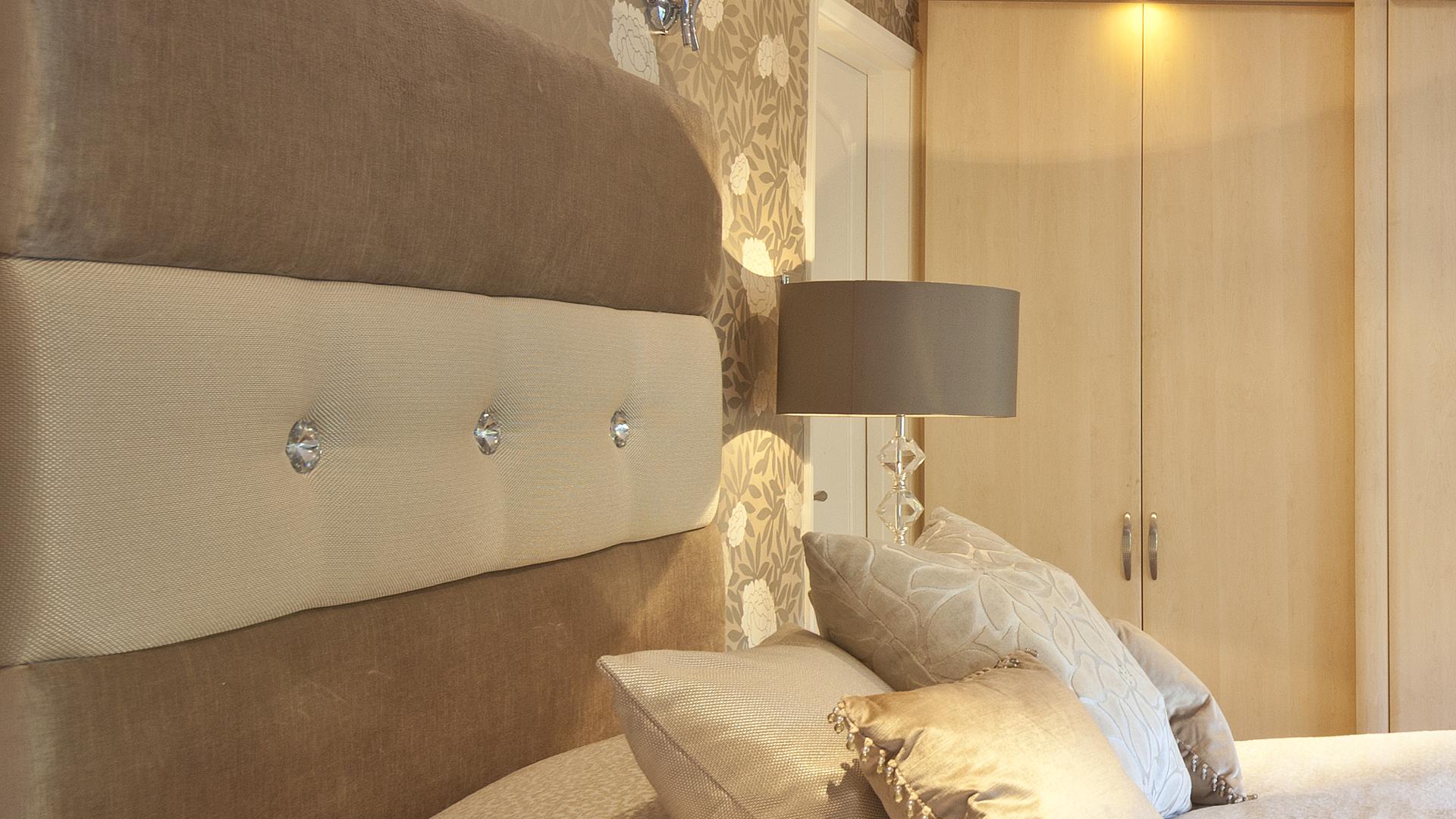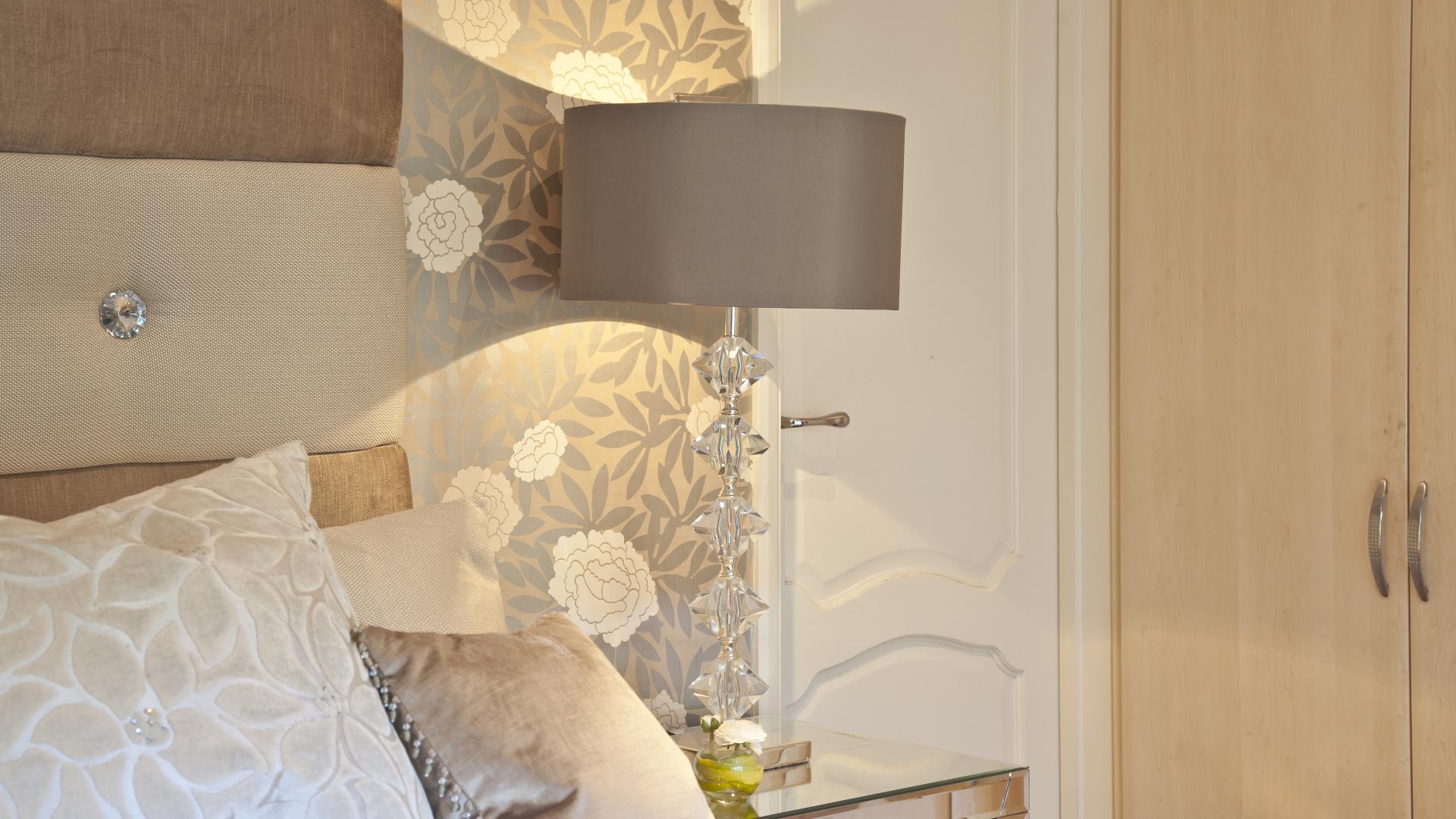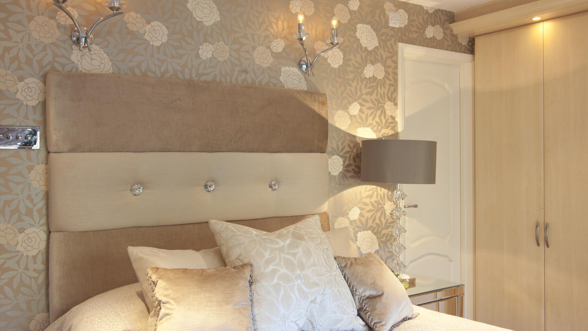 We chose a mixture of wallcoverings and textures to differentiate the spaces, whilst still creating a coherent flow between the two areas with the calming teal and cream colour pallet. The devil is in the detail in the master bedroom - small bespoke elements within this room elevate the design, such as Swarovski crystal elements hand embellised onto the cushion fabric with beautiful crystal detailing on the headboard.