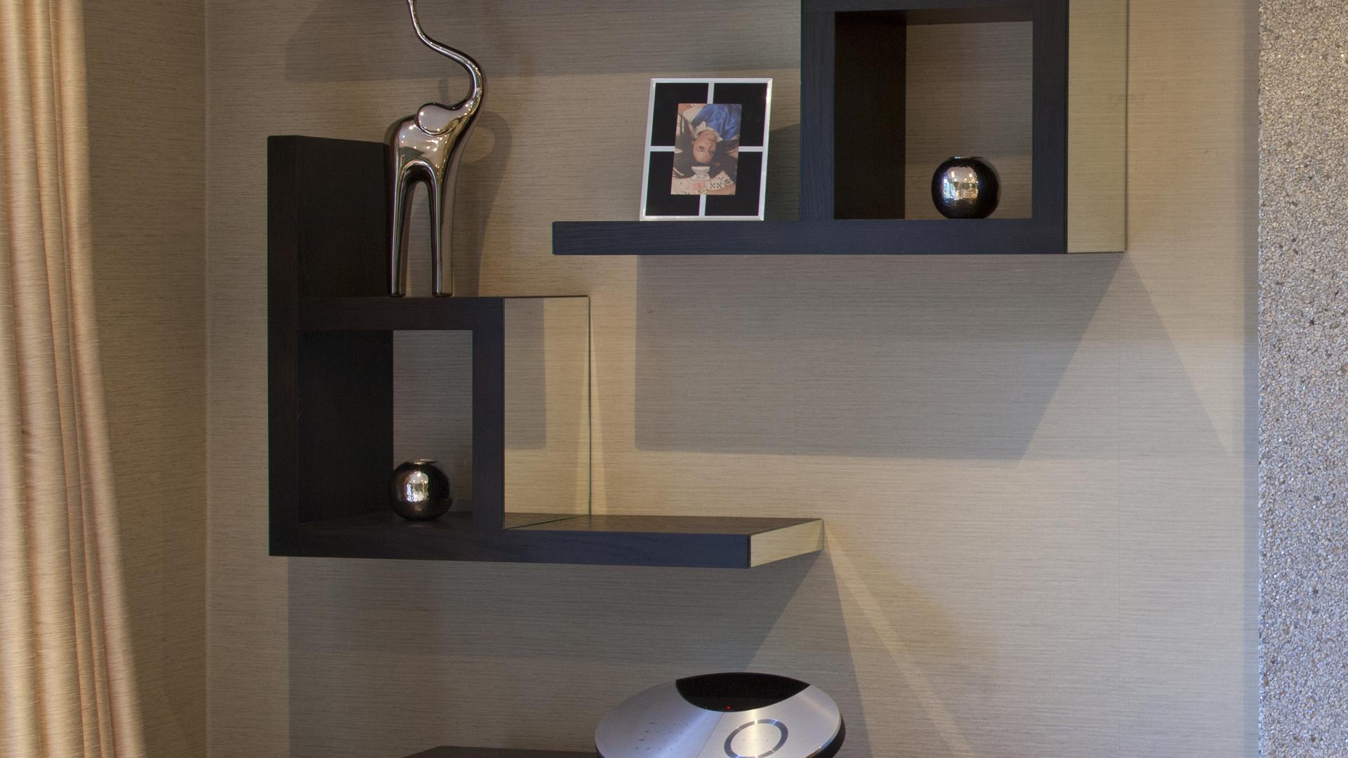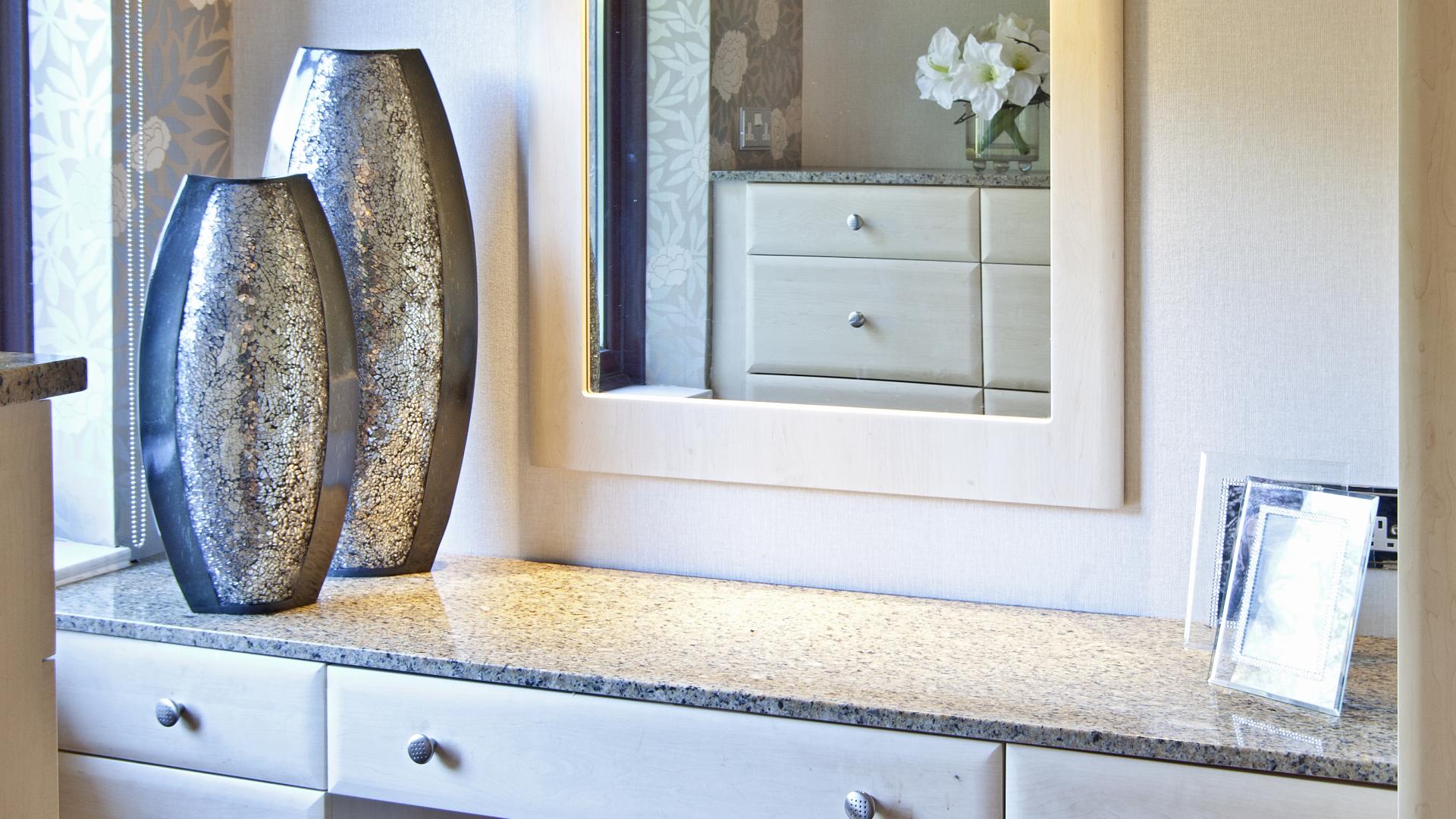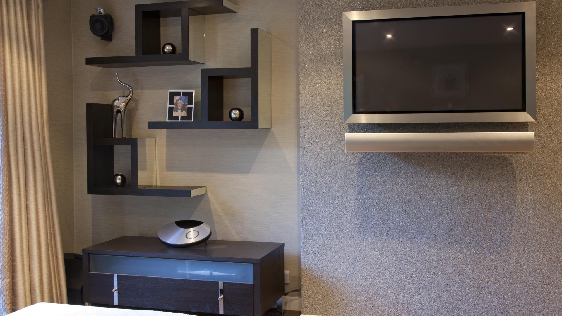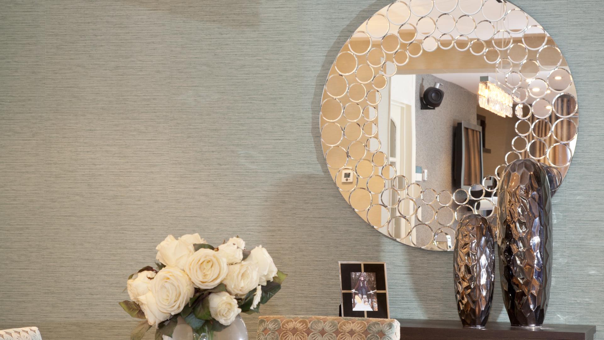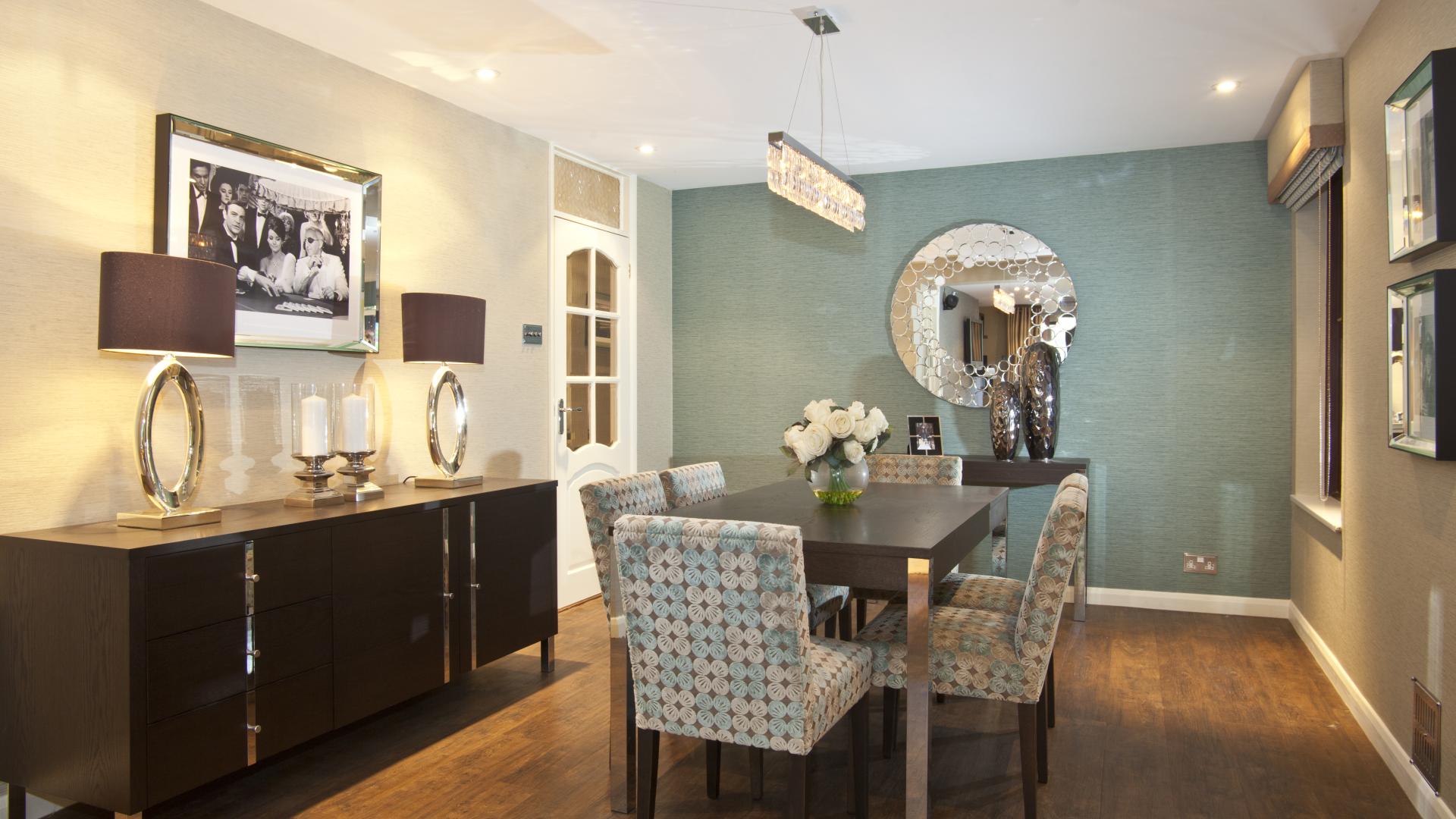 We chose a mixture of wallcoverings and textures to differentiate the spaces, whilst still creating a coherent flow between the two areas with the calming teal and cream colour pallet. The devil is in the detail in the master bedroom - small bespoke elements within this room elevate the design, such as Swarovski crystal elements hand embellised onto the cushion fabric with beautiful crystal detailing on the headboard.