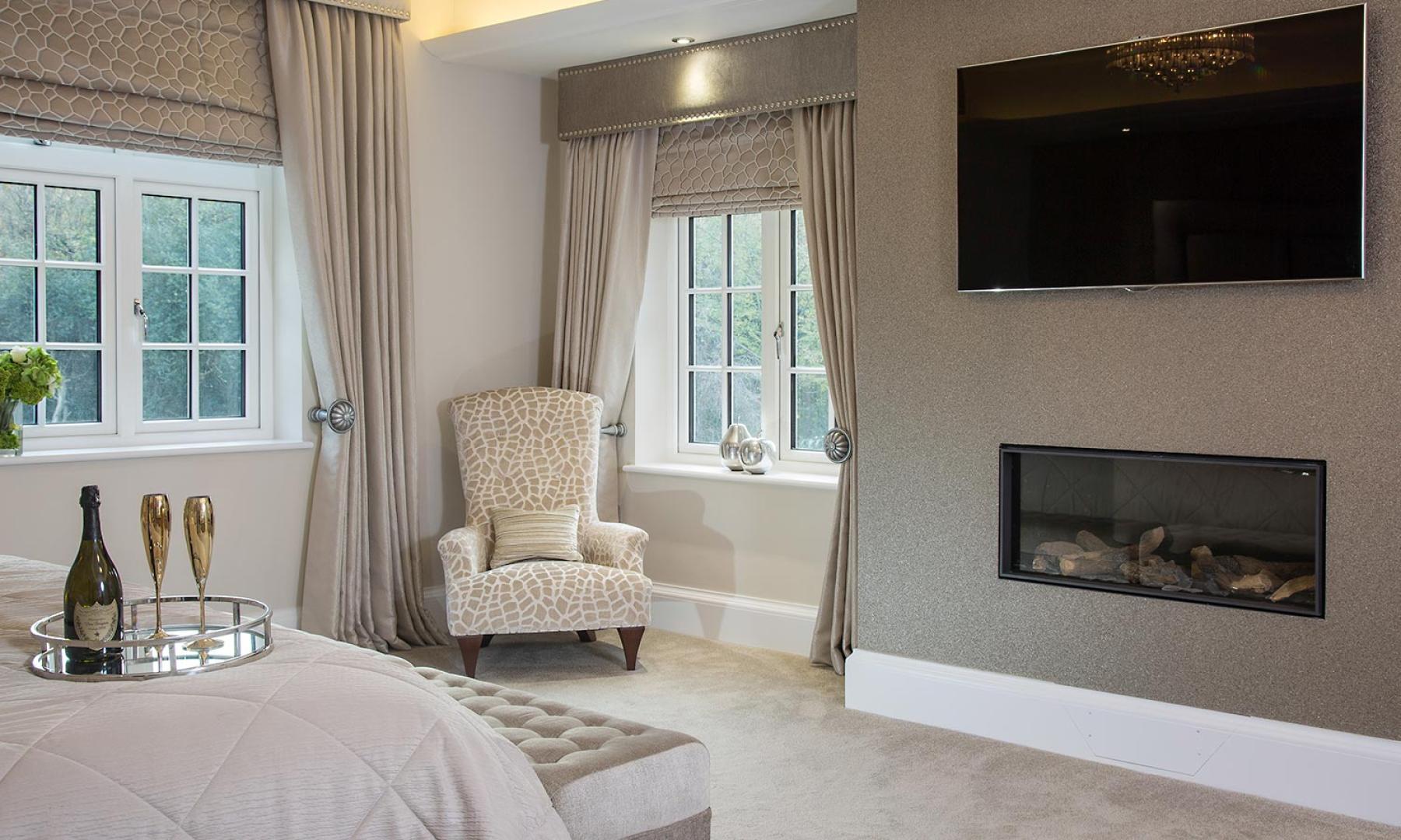 The project was implemented across a number of phases and included a set of stunning chandeliers, with the largest taking centre stage in the galleried landing. We gave each of the 5 bedrooms its own personality, from the relaxing suite for guests to enjoy, to a princess-inspired bedroom for the youngest member of the family. We are particularly proud of the bespoke joinery designed and fitted in the Master Dressing Room and Orangery, which both include exquisite mirror inlay detailing and beautiful fabric panelling.
