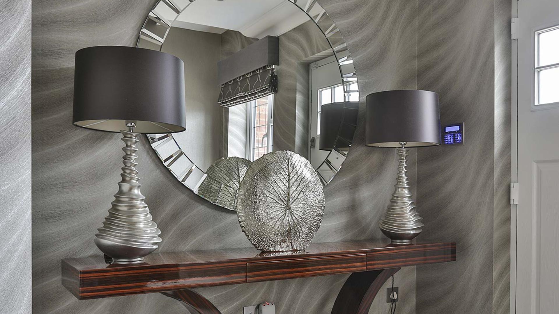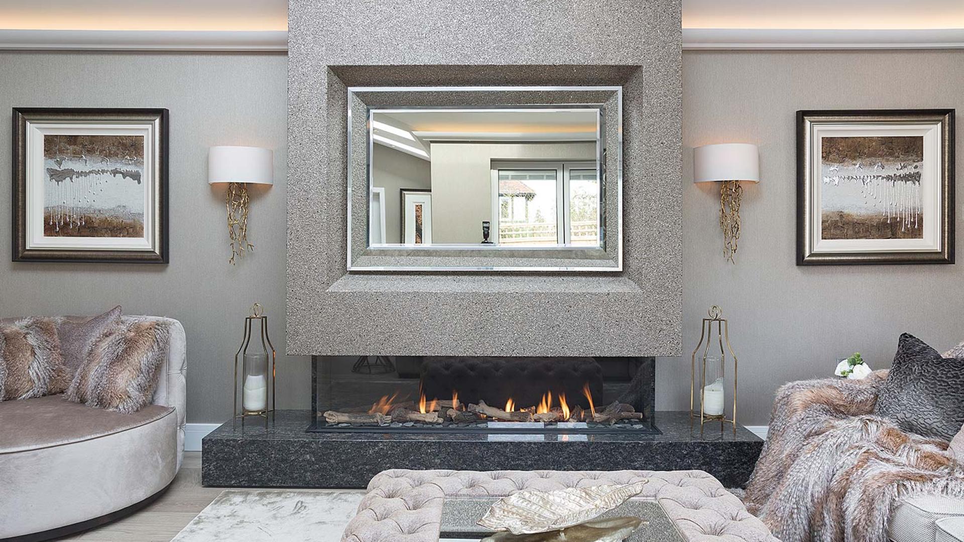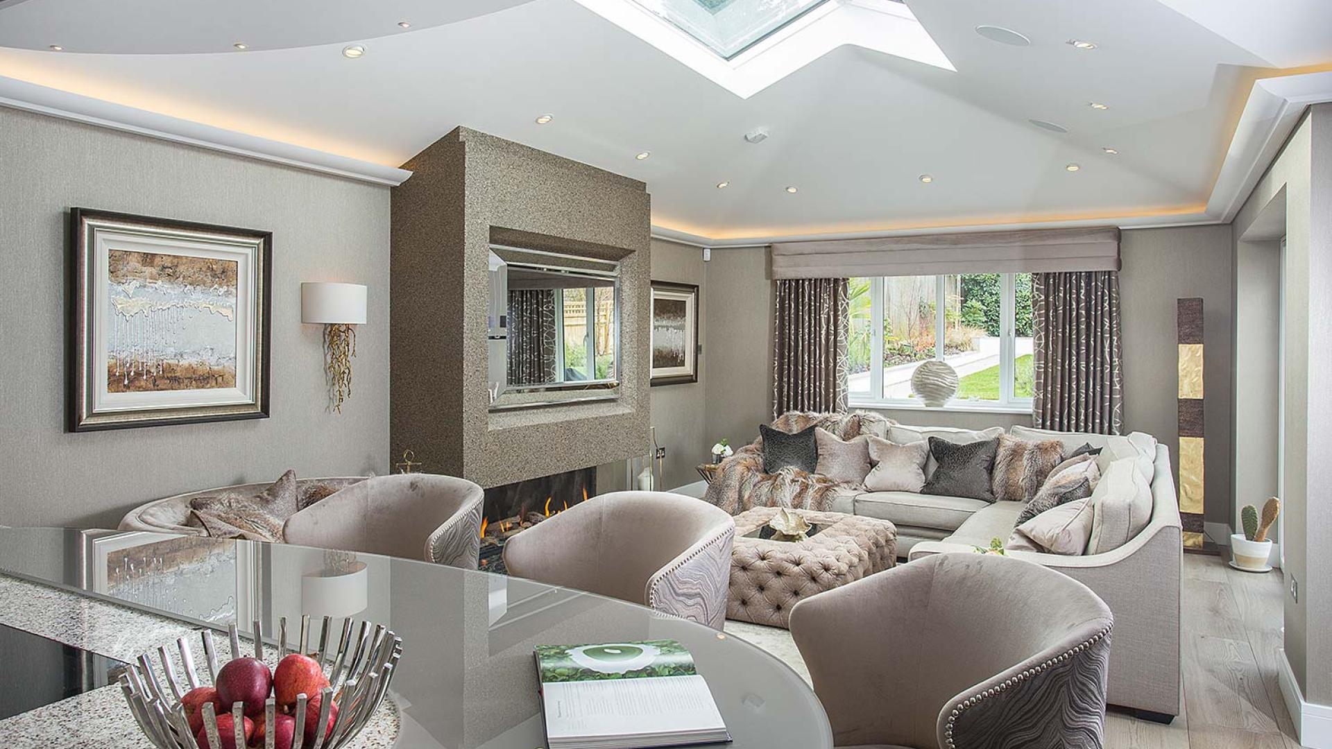 At the heart of the project is the stunning Kitchen/Diner, with bespoke Kitchen designed and created in conjunction with fine-furniture manufacturer Stoneham Kitchens, which incorporates tinted mirror doors and walnut inlay detailing. The showstopper of the project is the complex bespoke fireplace designed to fit the custom-made mirror TV and 3-sided linear gas fire.