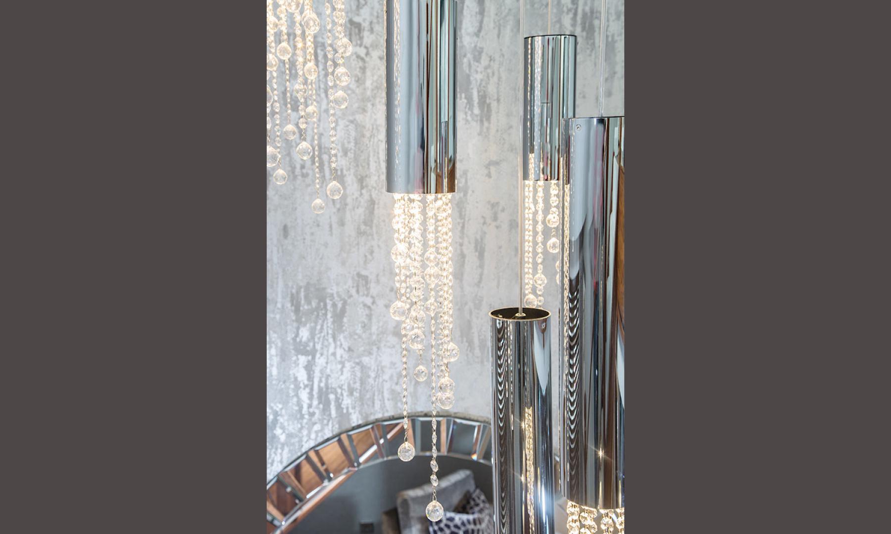 They wanted to create a look that was both effortless and elegant but also individual. We used a neutral pallet of greys with an accent of purple to create this design; the unusual wallpaper provides a dramatic yet stunning backdrop to the scheme.